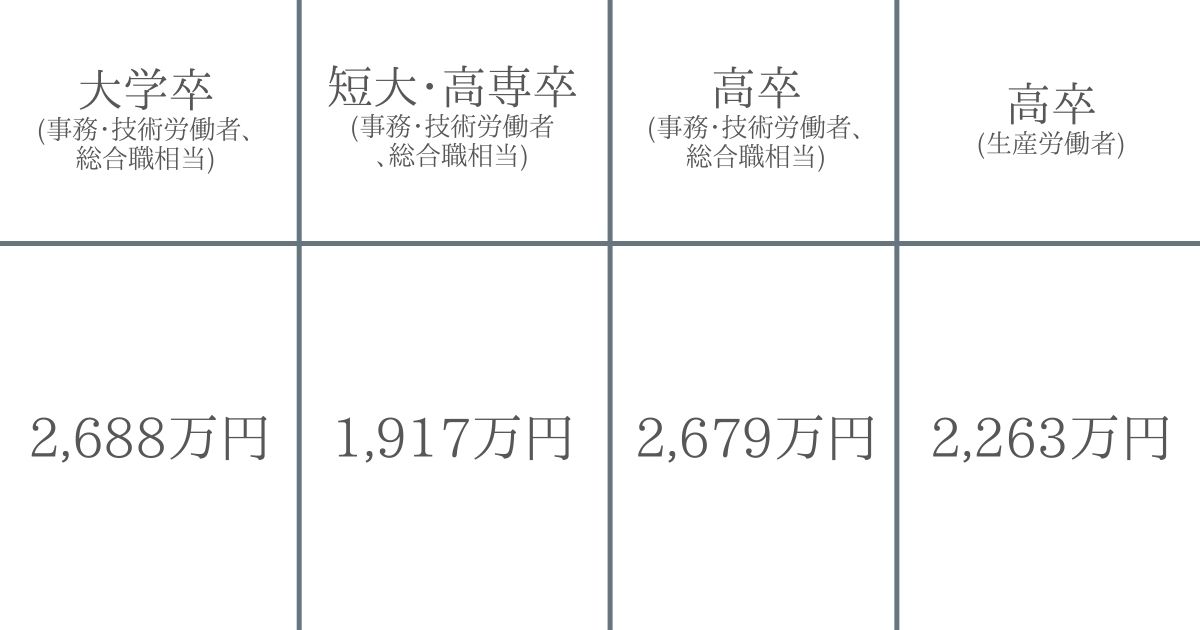 最も高いのは大企業に勤める大卒者で、相場は約2500万円。一方、中小企業に勤める高卒者の相場が最も低く1000万円程度となっています。