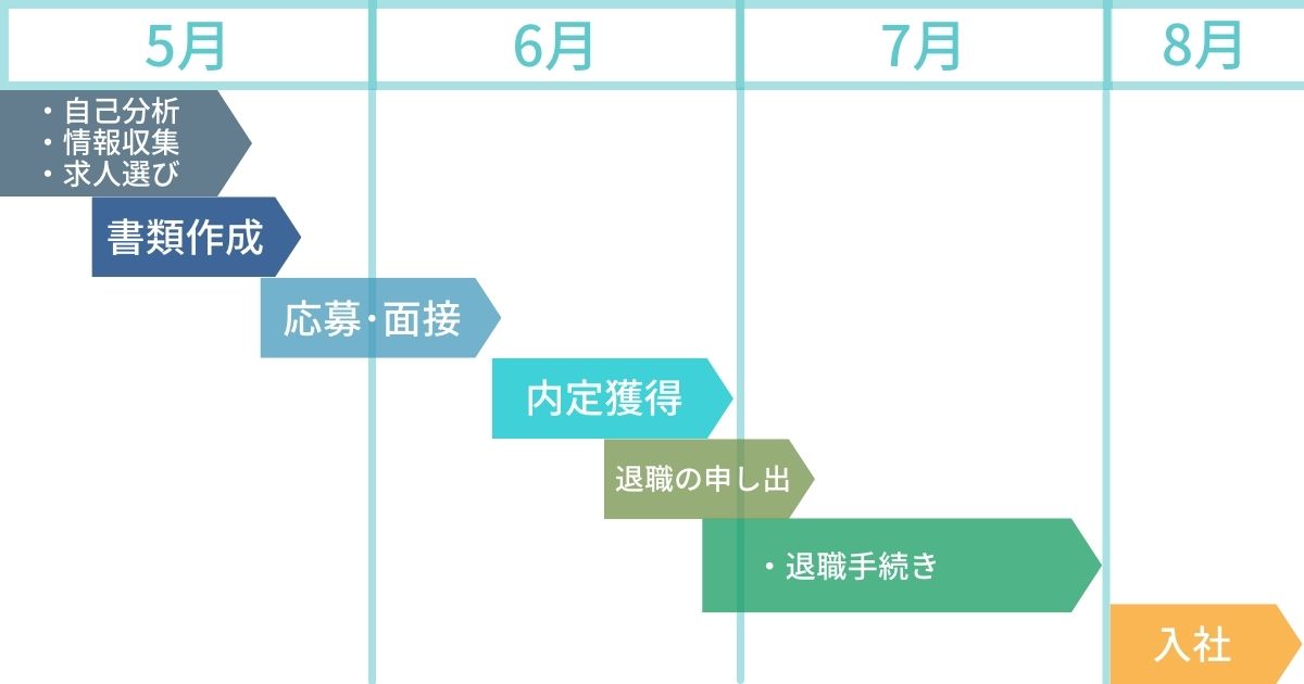 そこでここからは8月入社を目指す際の転職開始時期とスケジュールの立て方をご紹介いたします。