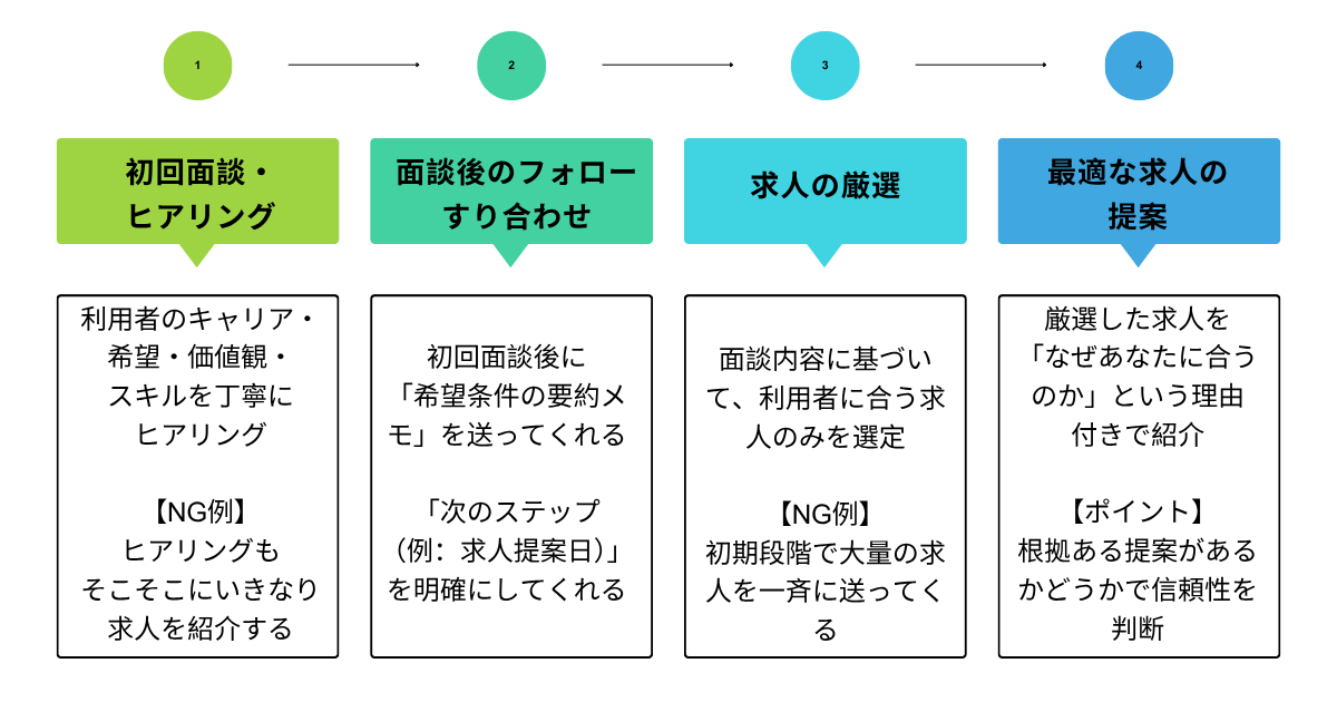 例えば、初回面談の後にこちらの希望条件をまとめた要約メモを送ってくれるか、あるいは次のステップが明確に提示されるかなど、具体的なアクションがあるかを見ておくと安心です。