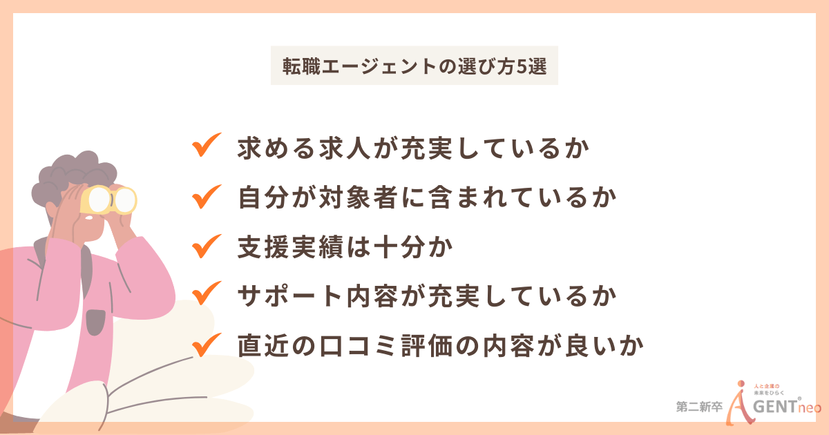 転職活動を成功させるためには、自分に合った転職エージェントを選ぶことが重要です。この見出しでは、転職エージェント選びのポイントを5つ紹介し、それぞれの特徴や注意点を詳しく解説します。転職エージェントを比較する際は、この5つの視点を「求める条件の一致度」と「サービスの信頼性」という2つの観点から整理するとわかりやすくなります。具体的には、前半の「求める求人が充実しているか」「自分が対象者に含まれているか」は“自分に合う案件があるか”を見極める軸、後半の「サポート内容が充実しているか」「直近の口コミ評価の内容が良いか」は“安心して任せられるか”を判断する軸です。自分に最適なエージェントを見つけるための具体的な方法を知りたい方にとって、有益な情報を提供します。